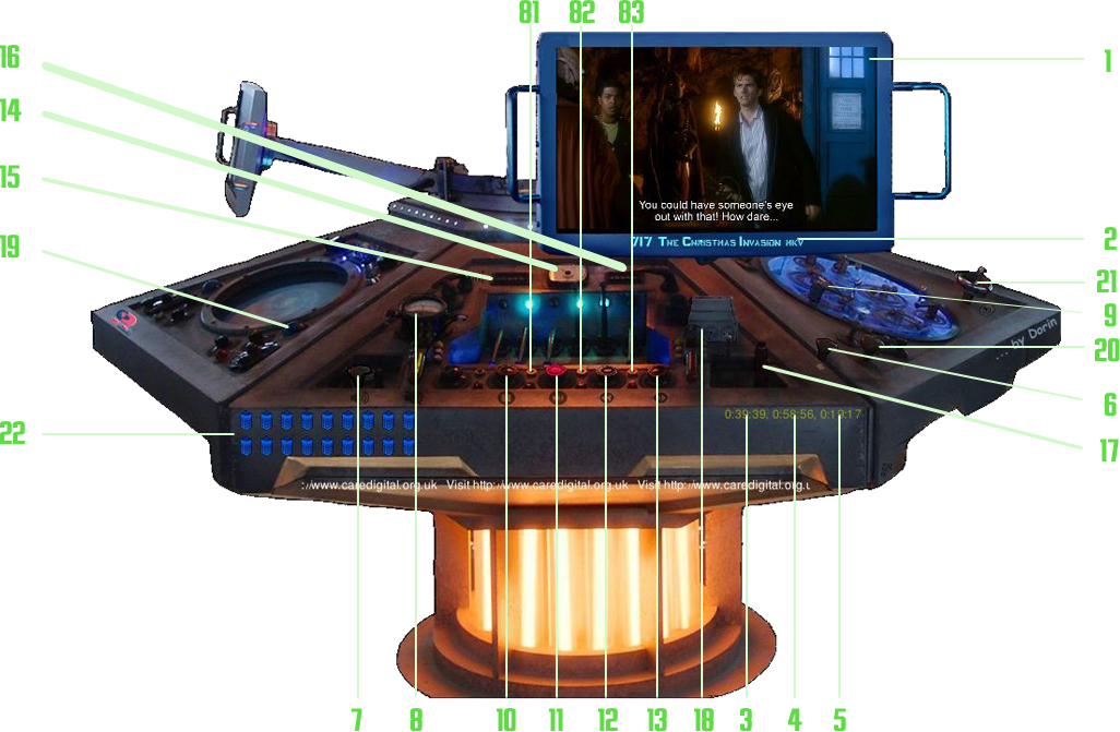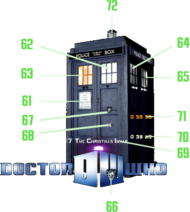 The title of the media is displayed across the doors of the Tardis (69), while the current timing position is shown on the bottom far side of the Tardis (70), with the total media time length displayed above it (71).