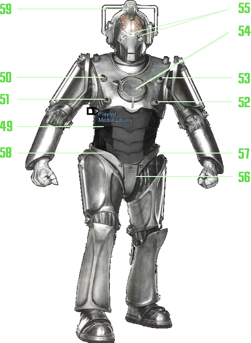 (56) - toggling the repeat of your playlist on or off -, the loop button (57) - which lets you repeat the current media -, or the shuffle button (58) - which will play next a random media from your playlist or the next one in the list.You can close the Playlist by clicking the Cyberman's top of the helmet