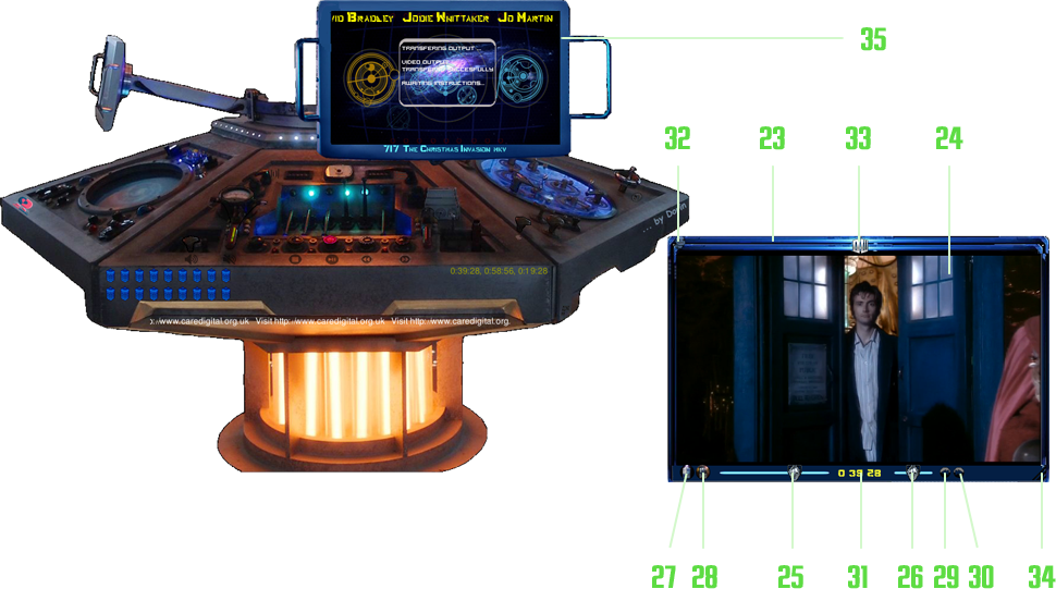 (23) can be activated by pressing the (9) lever, and can be closed, reverting the video feed to the main console, by clicking the "Dr. Who" logo from the middle-top of the window (33).This window comprises of the video playing area