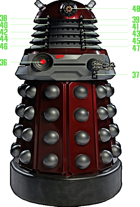 (36), which enables or disables the use of the Equalizer in processing the sound, a main volume amplifier slider (37), and the corresponding sliders for each of the sound frequencies - 60 Hz (38), 170 Hz (39), 310 Hz (40), 600 Hz (41), 1 KHz (42), 3KHz (43), 6 KHz (44), 12 KHz (45), 14 KHz (46) and 16 KHz (47) frequencies.The equalizer can be closed by clicking the eye stalk of the Dalek